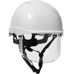 Type I, Non-vented Industrial Safety Helmet with fully adjustable four point chinstrap, Lightweight ABS Shell, Integrated Faceshield, 6-Point Polyester Suspension and Wheel Ratchet Adjustment